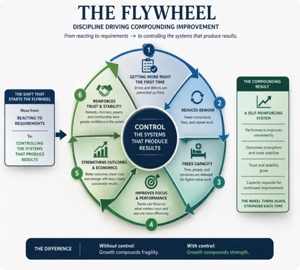 The shift is fundamental: from recovery to prevention. From fixing what broke to ensuring that it does not break again. From spending to “100” after the fact to maximizing how every dollar is spent. Each turn of the wheel brings prior risks under control while preparing for what comes next. Over time, effort compounds. Less energy is spent repairing the past. More capacity is directed toward building what will advance the delivery of care.