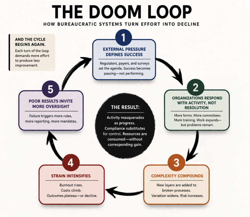 This is the doom loop healthcare has long believed it was immune to: activity mistaken for progress, compliance mistaken for control, and resources consumed with no corresponding gain. With each turn of the loop, more effort is required to produce less.