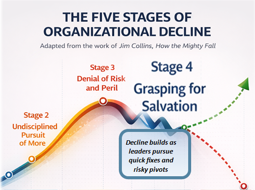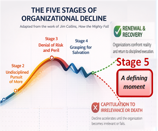 Bringing healthcare to the defining question: Will it continue chasing expansion while quietly accumulating costs, risks and unhappy patients…. or will it choose what Jim Collins calls renewal and recovery? Discarding the assumptions that have created its problems and embracing the discipline necessary for turning things around.