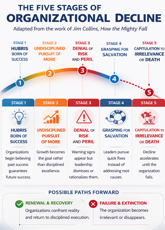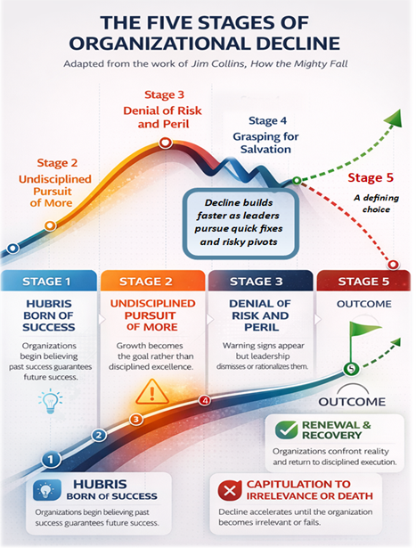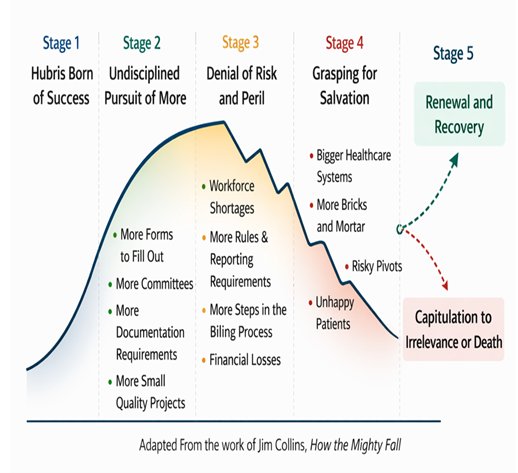 In this post, we will continue to explore how an industry capable of saving lives and advancing medical science finds itself where it is today. Looking through the useful lens of Jim Collins’ works about How the Mighty Fall, we will compare the uncomfortable trajectory of American healthcare to what he explains as the demise of once successful and powerful businesses as they pass through five predictable stages of decline—stories of failure that evolve when leaders cling to what they want to believe instead of confronting uncomfortable realities.
