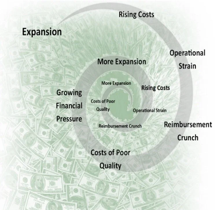 A healthcare system opens multiple urgent care centers and clinics in a region where population growth is limited and competition runs high. Fixed costs—facilities, staffing, equipment, and administrative overhead—rise faster than revenue. Meanwhile, payers continue exercising tighter control over billable services as expansion that was intended to produce growth simply disperses the same patient volume across more buildings and more staff until the math no longer works.