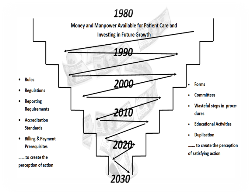 Bainbridge points out how industry approaches to things like EHR mandates could introduce the kind of breakthrough performance the industry desperately needs but generally do not as spending is dedicated to “chasing more” managed by tools that promote after-the-fact minimal compliance, not transformative advancement. Focused on the illusion that some satisfying action perceived to keep money in the pot for “chasing more” is enough with little consideration for the net loss delivered when all the math is done. Chasing new money in the absence of a business model where money and quality are managed like they are two sides of the same coin—and then compounding size of their losses with the kind of waste and inefficiency that create super tiny margins. Rarely improving financial, operational, and reputational health in the kind of meaningful ways create long-term because of an attitude about quality that escalates costs and frustration.